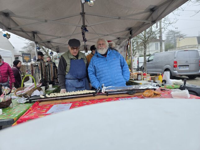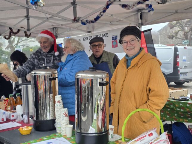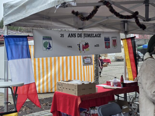 Le stand du jumelage au marché de Noël le dimanche 14 décembre. L’occasion de gouter les saucisses allemandes, les bretzels de la boulangerie Bisson à Bois-le-Roi, les biscuits réalisés par les adhérents.